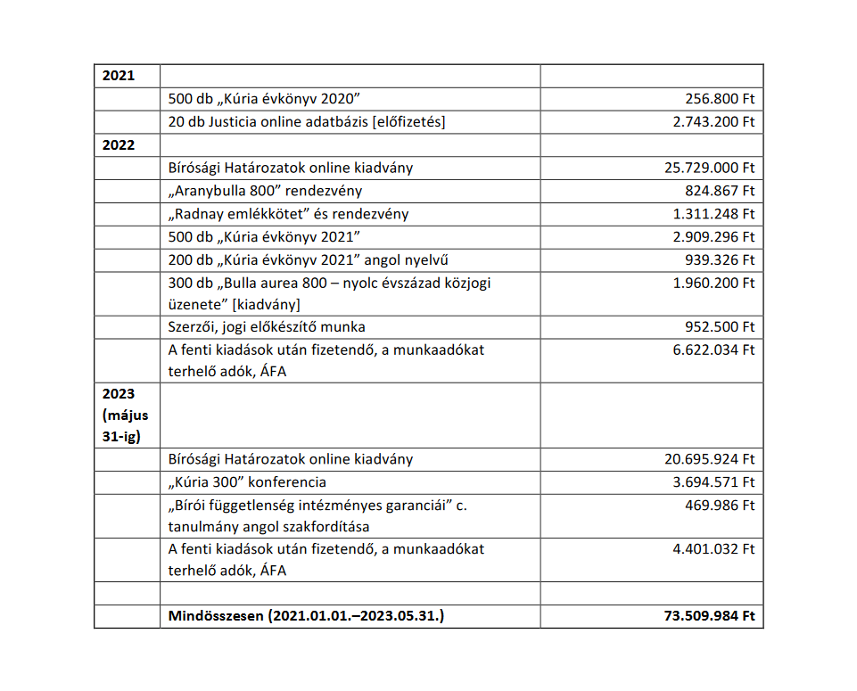 Az idei legnagyobb kiadásuk eddig egy havonta megjelenő online kiadvány 20,7 millió forintos megjelentetési költsége Kérdés, hogy a kúriai és európai bírósági határozatok .pdf formátumú publikálása miért kerül ennyibe, mindenesetre ez a drámainak szánt, de kissé nevetségesre sikeredett videó harangozta be, a legfrissebb számot pedig itt lehet elolvasni. 2022-ben ugyanerre a kiadványra közel 26 milliót költöttek.