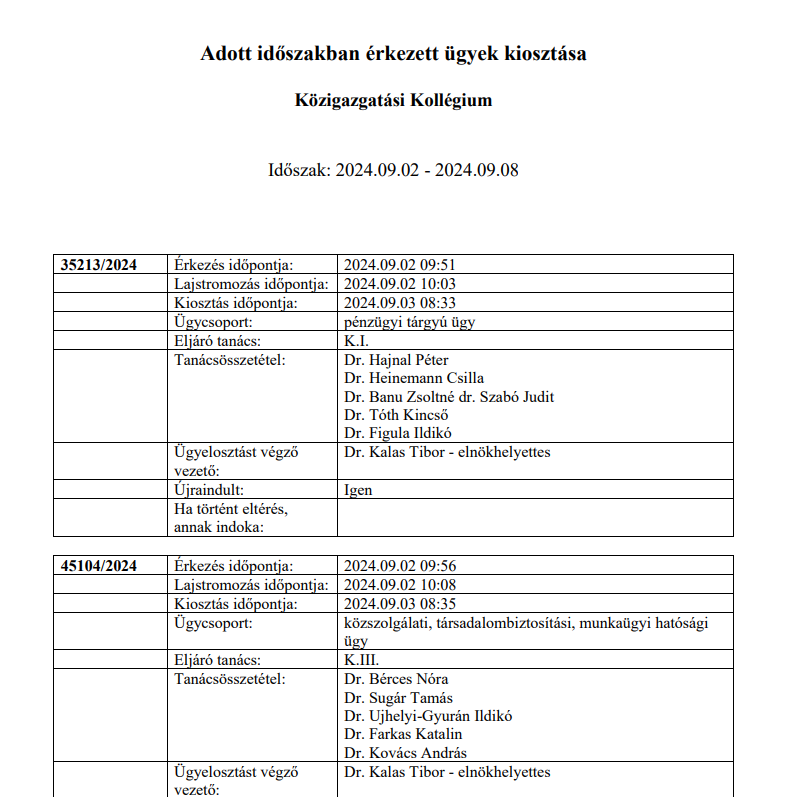 A cél tehát az volt, hogy objektív, előre meghatározott feltételek szerint osszák ki az ügyeket, és ez követhető legyen mindenki számára. Az előbbit elvileg bonyolult mechanizmusokon és kijelölési szabályokon keresztül az ügyelosztási rend biztosítja (ha valaki érez magában kellő elszántságot, itt találja az aktuálisat). Utóbbit pedig az, hogy 2023 júniusától a Kúria honlapján elkezdték közzétenni az ügyérkezéseket az ügyszám, az érkezés és a kiosztás napjával, illetve a tanács megjelölésével. Ez akkor még több sebből vérzett, például a pontos óra és perc megjelölése nélkül nem volt ellenőrizhető, hogy egy adott ügyet érkezési sorrendben osztottak-e ki.